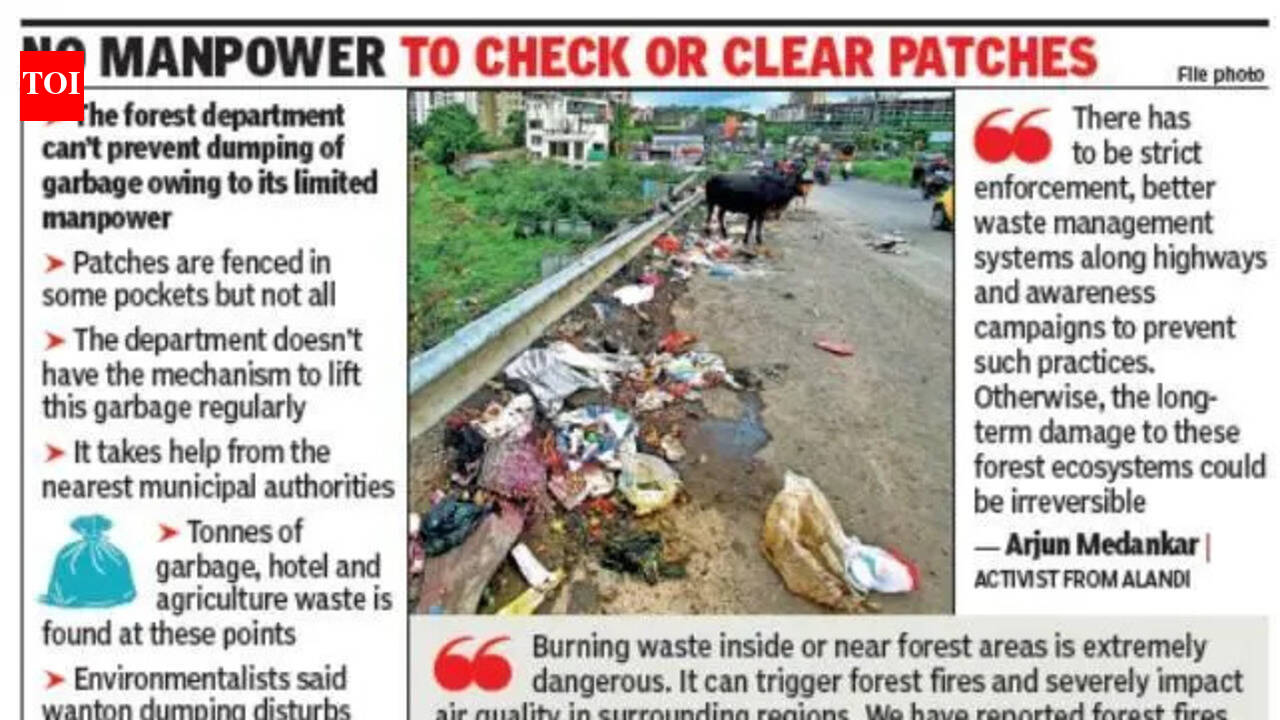 पुणे: पुणे आणि पिंपरी चिंचवड महापालिका हद्दीतील जंगलांच्या कप्प्यांमध्ये अनियंत्रित कचरा टाकणे ही गंभीर पर्यावरणीय चिंता म्हणून पुढे येत आहे, ज्यामुळे वन्यजीव धोक्यात येत आहेत आणि या ग्रीन झोनचा नैसर्गिक समतोल बिघडत आहे, असा इशारा वन अधिकारी आणि पर्यावरणवाद्यांनी दिला आहे.पुणे-नाशिक, मुंबई-बेंगळुरू, जुने पुणे-मुंबई, पुणे-सोलापूर, आणि पुणे-अहमदनगर मार्गांसह प्रमुख महामार्गांवर ही समस्या विशेषतः दिसून येते, जिथे प्लास्टिकचे ढिगारे, अन्न कचरा आणि भंगार हे जंगलाच्या परिसरात किंवा जवळचे दृश्य बनले आहे.वनविभागाच्या अधिकाऱ्यांनी सांगितले की, कचरा काढण्यासाठी फारशी यंत्रणा नसल्यामुळे गेल्या काही वर्षांत परिस्थिती अधिकच बिकट झाली आहे.“या डंपिंग साइट्स केवळ डोळ्यात भरणारा नसून एक मोठा पर्यावरणीय धोका आहे. वन्यजीव अनेकदा प्लास्टिक आणि इतर हानिकारक पदार्थांचे सेवन करतात, जे जिल्ह्यात नोंदवल्या गेलेल्या अनेक घटनांमध्ये प्राणघातक सिद्ध झाले आहे,” पुणे विभागाचे सहायक वनसंरक्षक मंगेश ताटे यांनी TOI ला सांगितले.प्रवाशांची आणि स्थानिकांची बेफिकीर वृत्ती या समस्येला आणखी वाढवत आहे. त्यांच्या रोजच्या प्रवासात लोक पर्यावरणीय परिणाम समजून न घेता या जंगलात कचरा टाकतात. त्यामुळे थेट प्राण्यांची अन्नसाखळी आणि अधिवास बिघडतो, असे अधिकाऱ्यांनी सांगितले.पर्यावरणवाद्यांनी निदर्शनास आणले की अशा डंपिंगमुळे मातीची रचना बदलते, पाण्याचे स्त्रोत दूषित होतात आणि सफाई कामगारांना आकर्षित करते, ज्यामुळे वन्यजीवांचे नैसर्गिक वर्तन बदलते.“जेव्हा प्राणी कचरा खाण्यास सुरुवात करतात, तेव्हा ते दीर्घकालीन पर्यावरणीय असंतुलनास कारणीभूत ठरते. तृणभक्षी प्लॅस्टिक खातात, तर मांसाहारी मानवी वस्तीच्या जवळ येतात, त्यामुळे संघर्षाचा धोका वाढतो,” असे या प्रदेशात काम करणाऱ्या पर्यावरण कार्यकर्त्याने सांगितले.अनोळखी व्यक्तींकडून टाकलेला कचरा वारंवार जाळणे ही चिंतेची बाब आहे. वन अधिकाऱ्यांनी सांगितले की अशा आगी अनेकदा दिवसभर सुरू राहतात, त्यामुळे विषारी धूर निघतो आणि केवळ वन्यप्राण्यांनाच नाही तर जवळपासच्या गावांतील रहिवाशांनाही धोका निर्माण होतो.वाढत्या समस्येबद्दल रहिवाशांनीही चिंता व्यक्त केली आहे.”कचरा जाळल्याचा धूर दिवसेंदिवस रेंगाळत राहतो आणि श्वास घेण्यास त्रास होतो, विशेषत: लहान मुले आणि वृद्धांना. आम्ही अनेक वेळा तक्रार केली आहे, परंतु नियमित साफसफाईची यंत्रणा नाही,” असे पुणे-नाशिक महामार्गालगतच्या एका बाधित वनपट्ट्याजवळ राहणारे मोई गावातील नागेश येळवंडे म्हणाले.शेतकरी देखील, डंपिंगमध्ये योगदान देत आहेत, अनेकदा या भागात कृषी कचरा आणि उरलेल्या उत्प